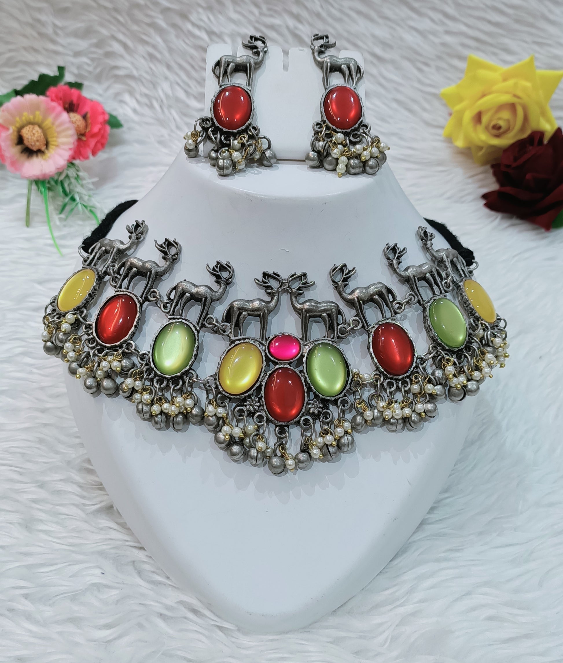 Ethnic Traditional Monalisa Stone Ghungroo Fashion German Silver Deer pattern Choker Necklace With Earrings Jewellery Set......