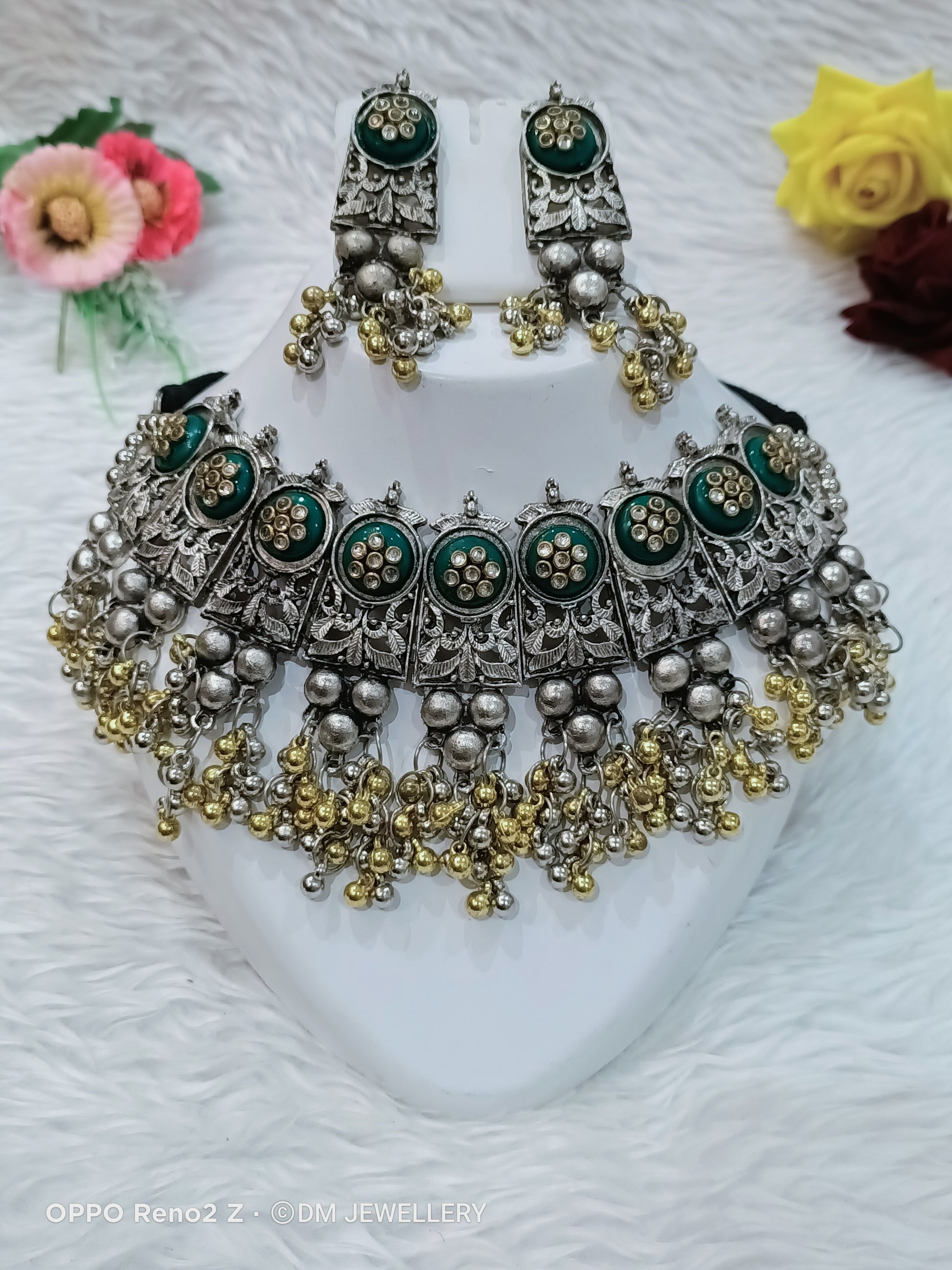 Ethnic Traditional Ghungroo Fashion SIlver Oxidised German Silver Choker Necklace With Earrings Jewellery Set......