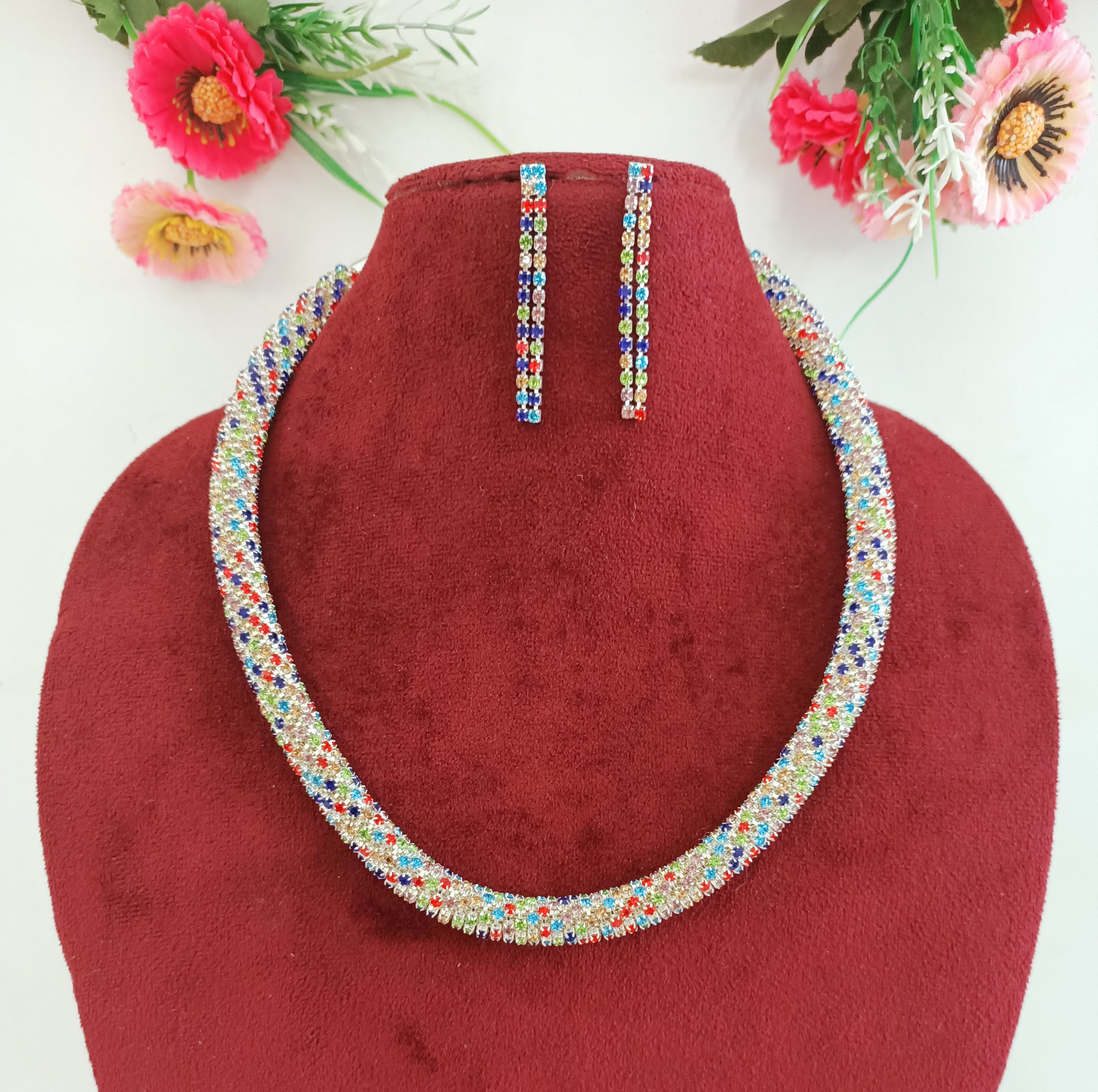 Vibrant Multicolor Ad Diamond Round Necklace Set Includes One Necklace And a Pair Of Earrings....