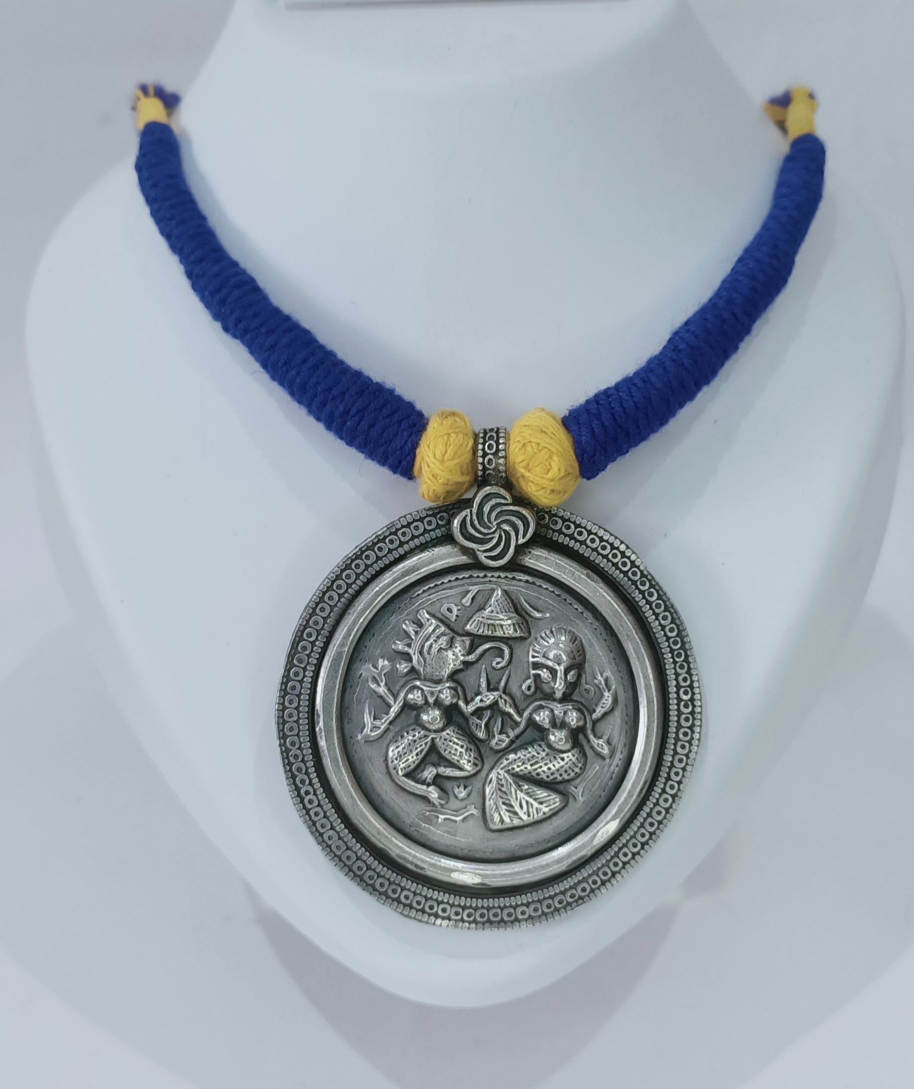 Hand crafted Tribal-Style Necklace Featuring a Large, Round Oxidized Silver-Tone Pendant With Intricate Engraving....