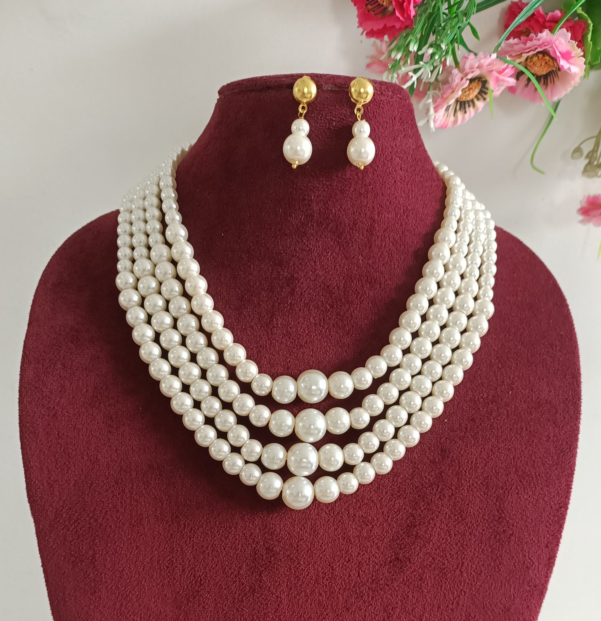 Elevate Your Elegance With This Stunning Golden Pearl Beaded Necklace With Earrings Featuring 4 Layers Of Glossy, Uniform White Faux Pearls,..